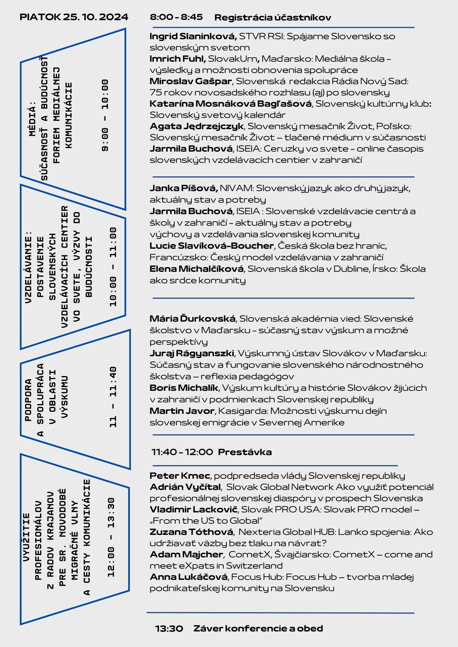 S radosťou vám predstavujeme program nadchádzajúcej Stálej konferencie Slovenská republika a Slováci žijúci v zahraničí 2024, ktorá sa uskutoční v dňoch 24. – 25. októbra v Bratislave.